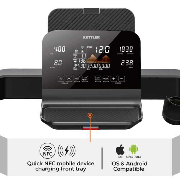 Une nouvelle génération de tapis roulants, le KETTLER DORTMUND S1 , se concentre sur le divertissement et la convivialité avec le chargement sans fil NFC . Gardez le cap, un tapis roulant pliable de pointe avec des coussins confortables pour préserver vos articulations . Il comprend un excellent amorti,